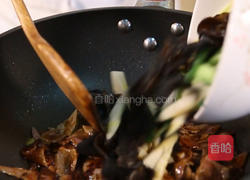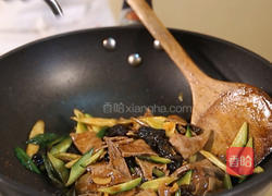 9.锅内放入5克食用油,待油加热到7成热时,放入葱姜蒜爆香,倒入调好的碗欠勾成汁,把猪肝,黄瓜,木耳,冬笋倒入翻炒,使欠汁均匀地裹在猪肝上。