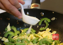8.待苦瓜炒至翠绿色时,放入炒好的鸡蛋翻炒。