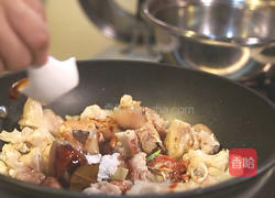 5.加入焯好的猪蹄,放入蚝油15克,老抽5克,生抽5克,酱豆腐汁20克,鸡粉15克,料酒15克,胡椒粉5克,白糖10克,味精5克,大火翻炒。