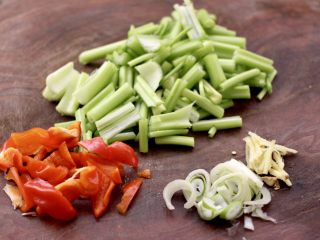 锅中倒入适量的清水烧开,加入少许盐和几滴食用油,把芹菜进行焯水,变色即可捞出。