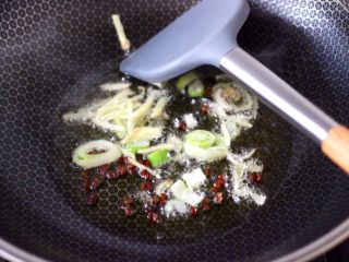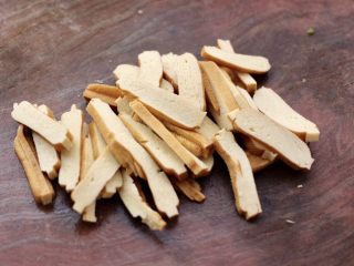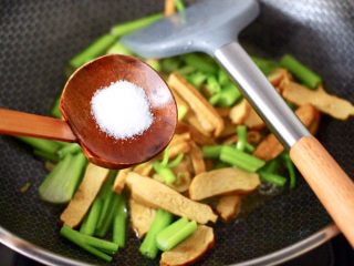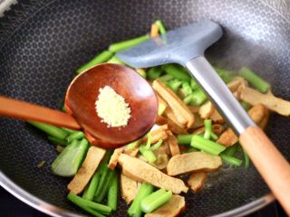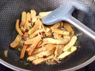 这个时候放入香干,小火慢慢煎至一会、加入调色。