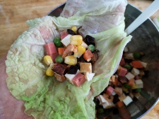 将烫软沥水的白菜叶铺在手心里,用勺子将蔬菜丁放在白菜叶的中间。