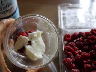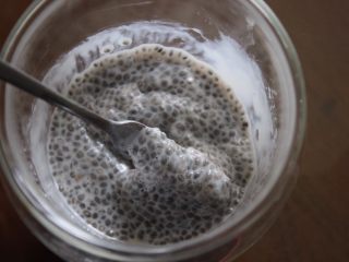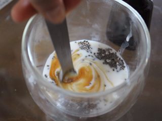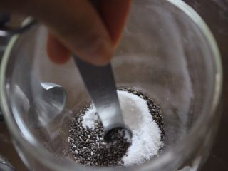 在杯子里,倒进奇亚籽还有糖或蜂蜜(按照你自己的口味加,我建议糖加5ml或蜂蜜加10ml)