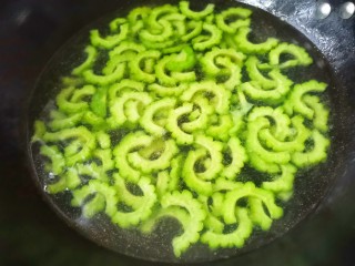 锅中烧开水,加一点点盐,加苦瓜焯水2分钟,