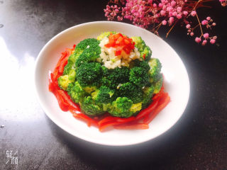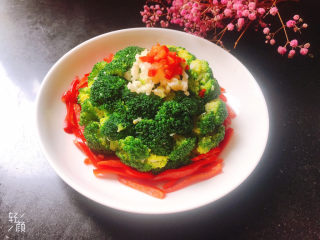 把小碗西兰花倒扣在盘子里,剩余的蒜末放上 面,放一点红椒碎,完成!