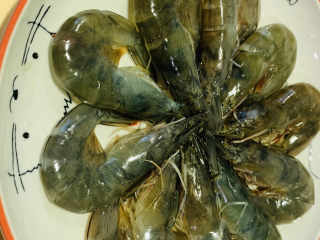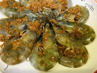 用勺子,把炒好的蒜蓉浇在每只虾上;