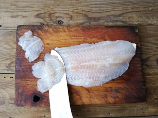 将片自然解冻,斜刀片成约5mm厚的鱼片。