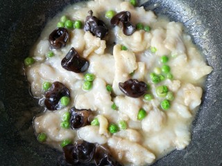 加一点盐、调味后,再加入轻轻地晃动锅,不要用锅铲多翻动鱼片,以防鱼片碎散,再放入焯熟的木耳和青豆。