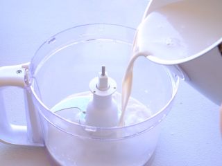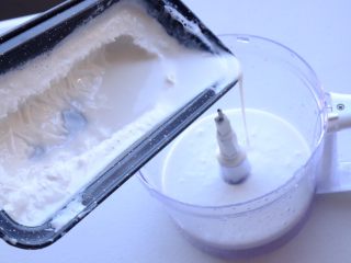 从冷冻层取出 将盘中所有东西都倒入食物料理机 如果家里有电动打蛋器 建议用打蛋器会快很多