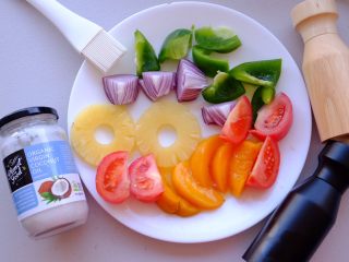 Grill盘上涂抹椰子油 放上食物 接着就是滋啦滋啦烤的声音啦 我喜欢烤的略焦的感觉 就是那种会留下烤盘纹路的样子