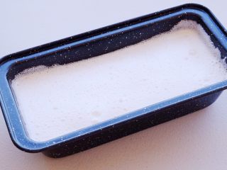 找一个做Loaf的烤盘 或者深6cm 9.5cm*19cm 反正不要太深或太浅就好啦 把液体倒入烤盘 盖上保鲜膜 放入冷冻层 冻3小时或者直到烤盘边缘出现冷冻层