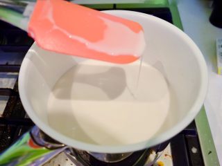 用中小火加热 慢慢搅拌 直到液体变光滑 小心不要加热至沸腾哦