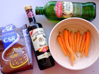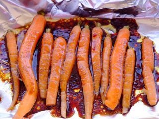 将胡萝卜浸在调料里 放进烤箱 200度 20分钟 烤好后开烤箱门要留意哦 好大的一股醋味儿~如果没有烤箱可以用平底锅试一试