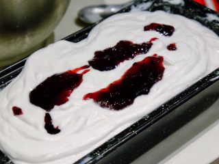 将液体倒回烤盘 一小勺一小勺地放上果酱 用黄油刀搅拌 再放下一勺