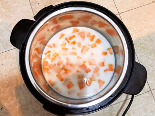 把浸泡后的米和牛奶液倒入锅里