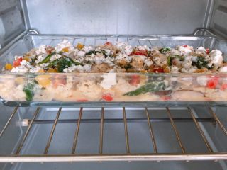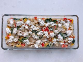 将材料装入烤盘,倒入剩余蛋液,放上塔塔香草干酪,在表面撒上适量普罗旺斯香草和胡椒碎