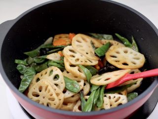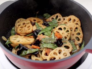 锅中倒入适量的清水烧开后,加入少许盐和食用油,放入藕片和眉豆,胡萝卜和木耳。