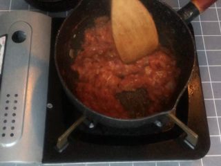 洋葱炒软后下番茄碎小火慢炒,番茄出汁后加入一勺番茄酱