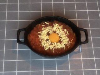炒好的番茄泥铺在烤碗里,用勺子压出一个坑
