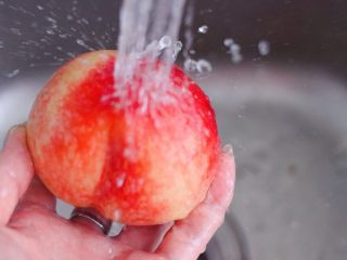 把先用刷子刷去表面上的桃毛,然后用自来水反复冲洗干净,对桃毛过敏的亲们,一定要带上手套操作喲。