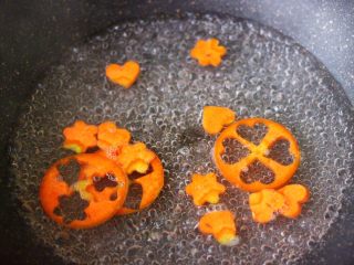锅中倒入适量的清水,加入少许盐烧开后,把胡萝卜焯水,看见胡萝卜断生变色的时候,捞出沥干水分备用。