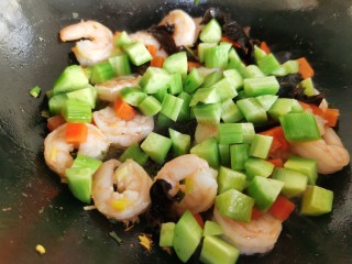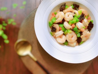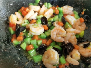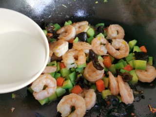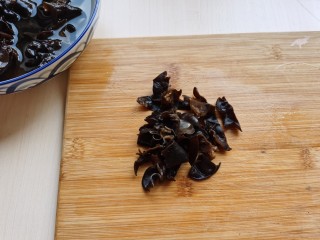 将胡萝卜和木耳放入沸水中焯水几秒钟,捞出用冷水冲一下,控水备用。
