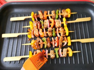 牛排锅或者平底锅先预热一下,然后放入穿好的肉串,大火煎一下,每个面都要煎到,封住肉里面的汁水,这样能使煎出来的肉串口感嫩滑多汁。