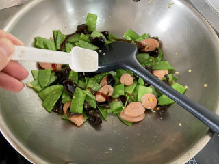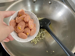 加入火腿肠,中小火煸炒到微焦