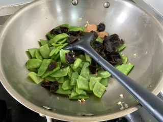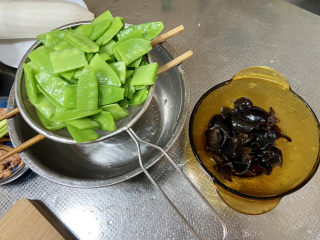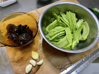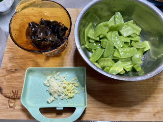 清洗:荷兰豆摘去老筋洗净,木耳揉搓洗净,姜搓洗干净,蒜剥皮洗净