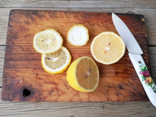 柠檬用陶瓷刀切薄片。(最好不要用金属刀切水果,水果中的酸碱盐等电解质会加速金属的化学反应,使金属锈易生锈斑)