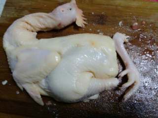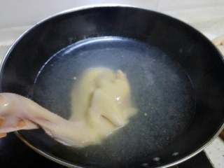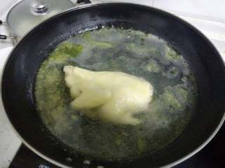 半锅水烧开后,用手捏住鸡头,将鸡身放入开水中浸汤,每隔几秒钟将鸡提出,这个过程反复几次,可以让鸡表面定型也可以保持鸡肉鲜嫩。