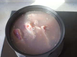 锅中加水,放排骨,焯到有浮沫出现,把排骨捞出来用温水洗净,控干水分备用;
