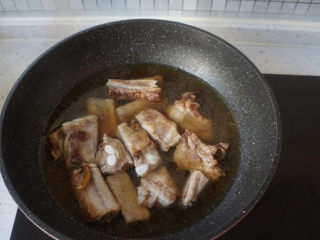 锅中加少许油,炒香姜片,放入排骨,煎至两面微黄;