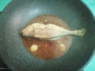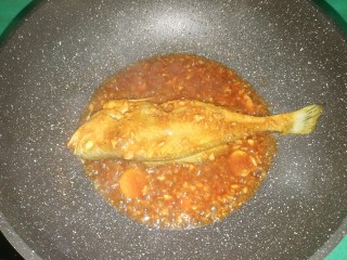 放入煎好的黄花鱼,取一个小碗,放少许玉米淀粉,加少许水调开,倒入锅中,中火煮开