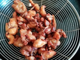 用略大于中火的火候炸鸡块。(超大火容易炸糊,中小火容易将鸡块炸得绵而不酥,鸡块口感易老)
