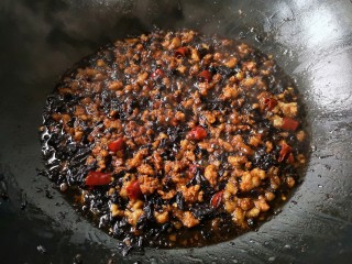 将泡发好的梅干菜攥去水后倒入锅中,中火翻炒出香味。