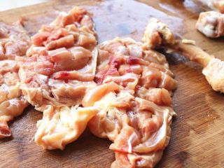 提前从冰箱冷冻室里拿出来,在冷藏室自然解冻后待用。准备一把厨房剪,剔出鸡骨头,这是只做给最爱的人吃的菜,吃起来很省事。