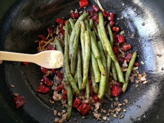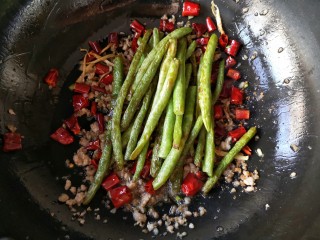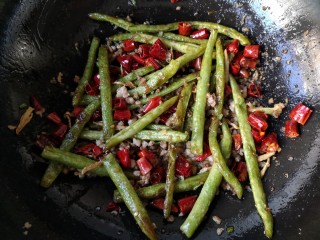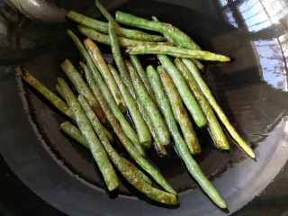 锅中适量油(30克左右,不用太多)烧热,把沥干水的芸豆入锅,中小火不断翻炒,至芸豆表皮皱褶微焦后沥油盛出备用。