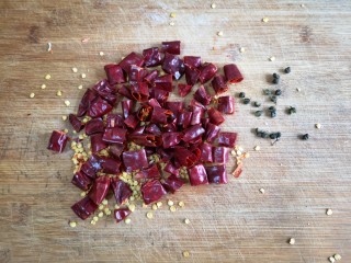 干辣椒洗净切段,麻椒(深绿色的那种,红褐色的是花椒味道不似麻椒那样浓郁)10-20粒。(可根据个人口味增减)