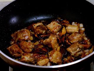 热锅热油,先下排骨中小火煸炒出部分水汽,至焦黄。这样处理的排骨才香,口感也好。