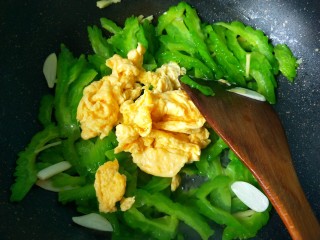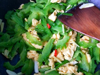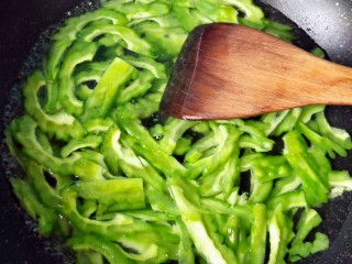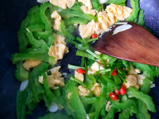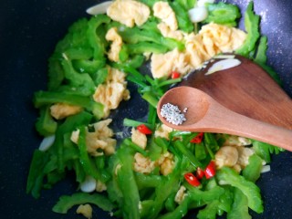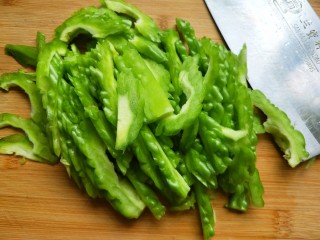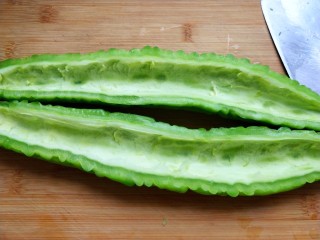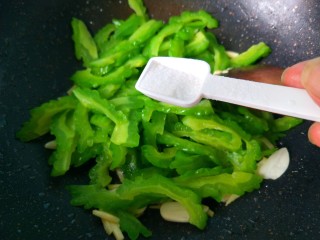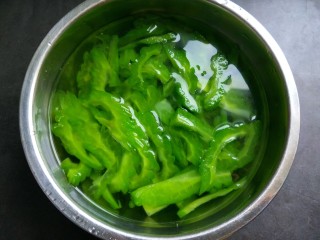 锅内放清水,放一小勺盐,放几滴油,水开后放入苦瓜焯水两分钟。