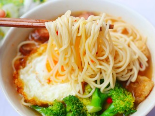 面条上铺上鸡蛋,西兰花,香肠,油豆腐,一碗酸酸辣辣超级开胃的灵魂酸汤面就可以吃啦。