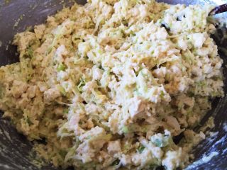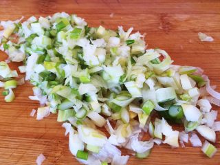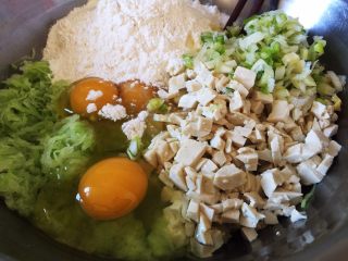 萝卜丝晾温,和葱末、豆腐碎、、放一起