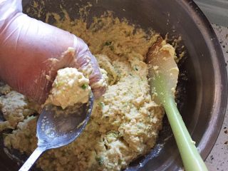 锅内放油,中火加热,至四成热,用手抓起一些拌好的丸子馅,用虎口挤出丸子,用勺子铲起