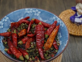 另起锅倒油,油热后放入浸泡的干辣椒和花椒,小火慢炒