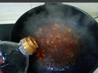 锅中底油,放入葱、姜、蒜、花椒粒、煸炒,加入炒出红油