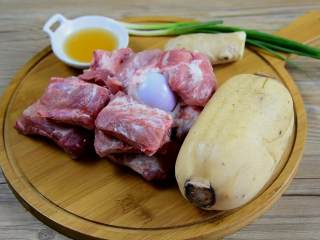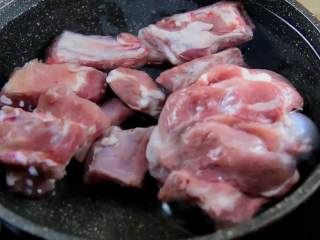 锅中放入排骨、棒骨、莲藕,加入葱结、姜片、料酒2勺,再加满开水。
