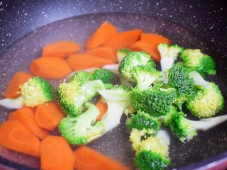 加入胡萝卜和西兰花,翻炒均匀
