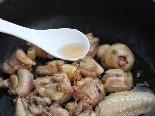 放入鸡块改大火翻炒变色,发现家里还有两个鸡翅,所以一起放进去了
