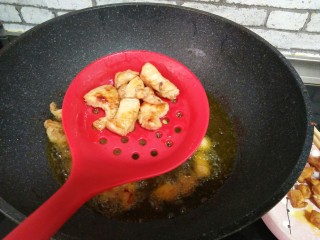 锅中油八成热,加腌制好的鸡胸肉炸制